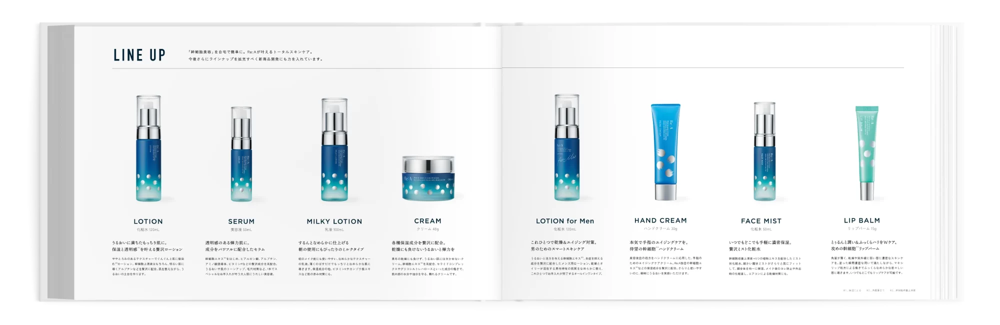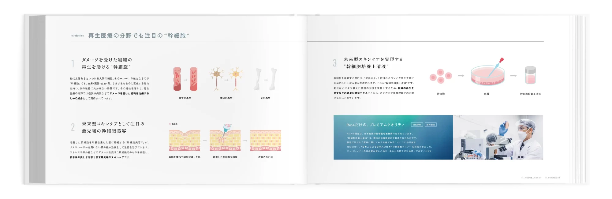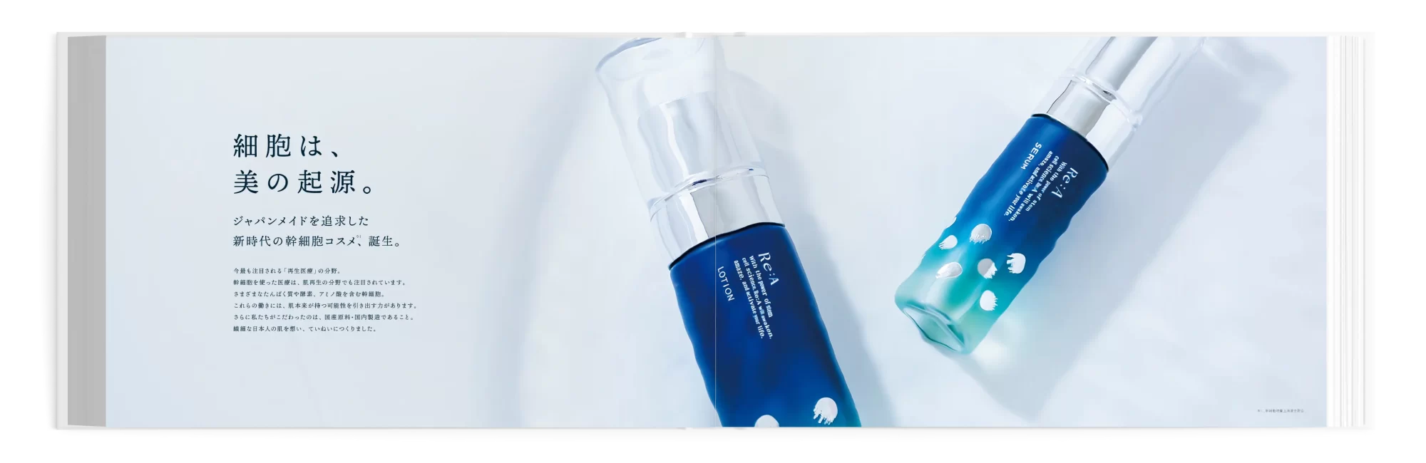 幹細胞コスメブランドのブランドブックのデザインを担当しました。 従来の高級感と信頼感のあるイメージは残しつつ、ファッション誌のようなお洒落さもほしいとのご依頼から、撮影ディレクションから担当しました。 医学的な固めのページもあるなか、少しだけレイアウトを崩したページを設けることで、少し一息つけるようなブランドブックに仕上げました。