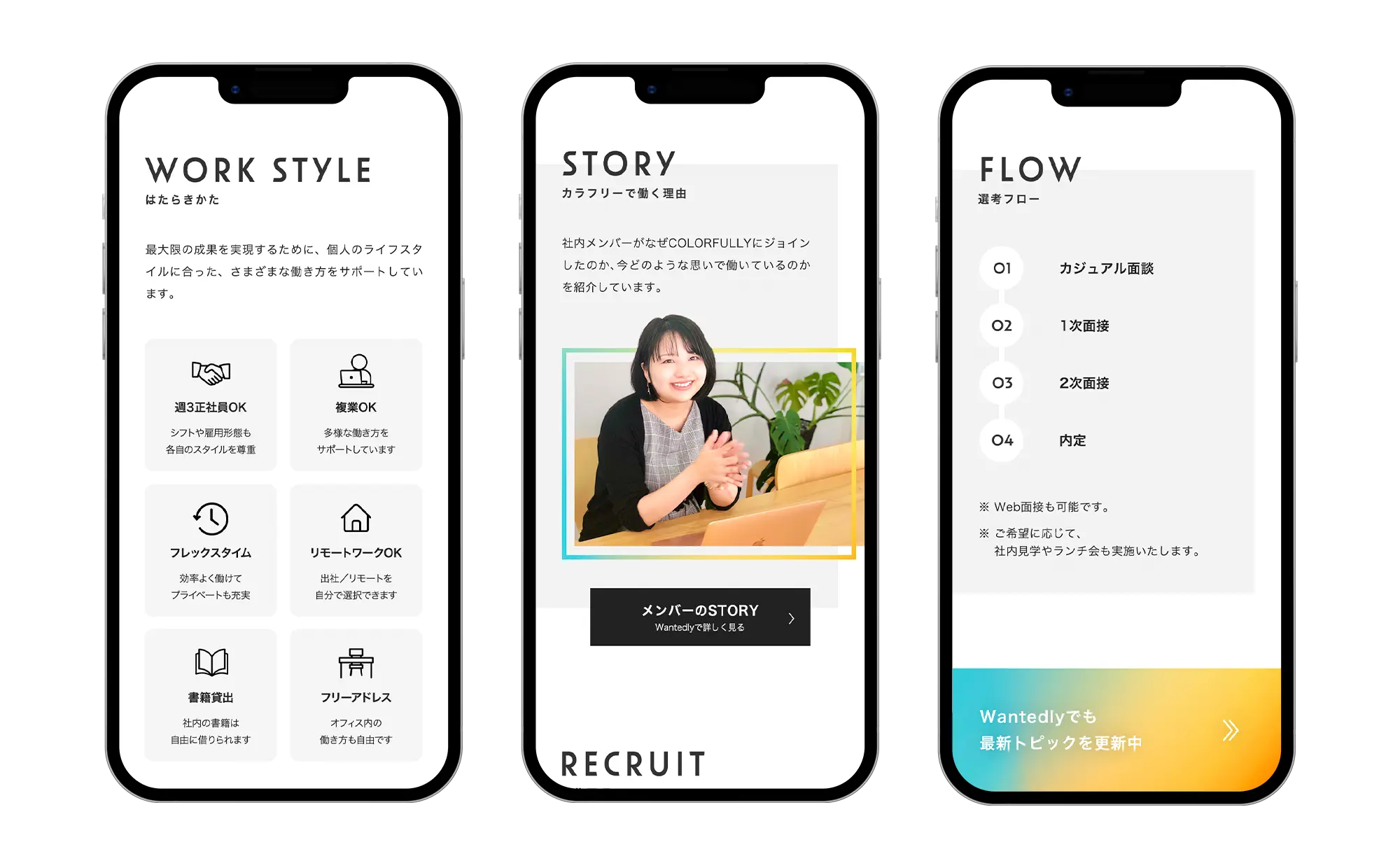 MONOKROMからCOLORFULLYに社名が変わったタイミングで、 リクルートサイトも制作したいとのことで制作しました。 多様性や自由な働き方を強みとする会社なので、 求職者が親しみやすさと応募したいと思えるようなサイトを目指しました。