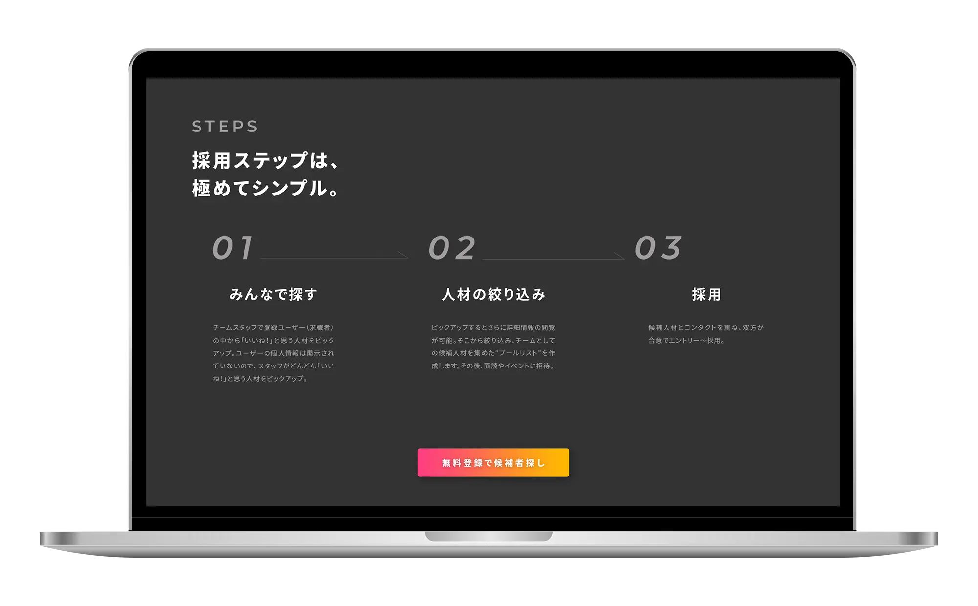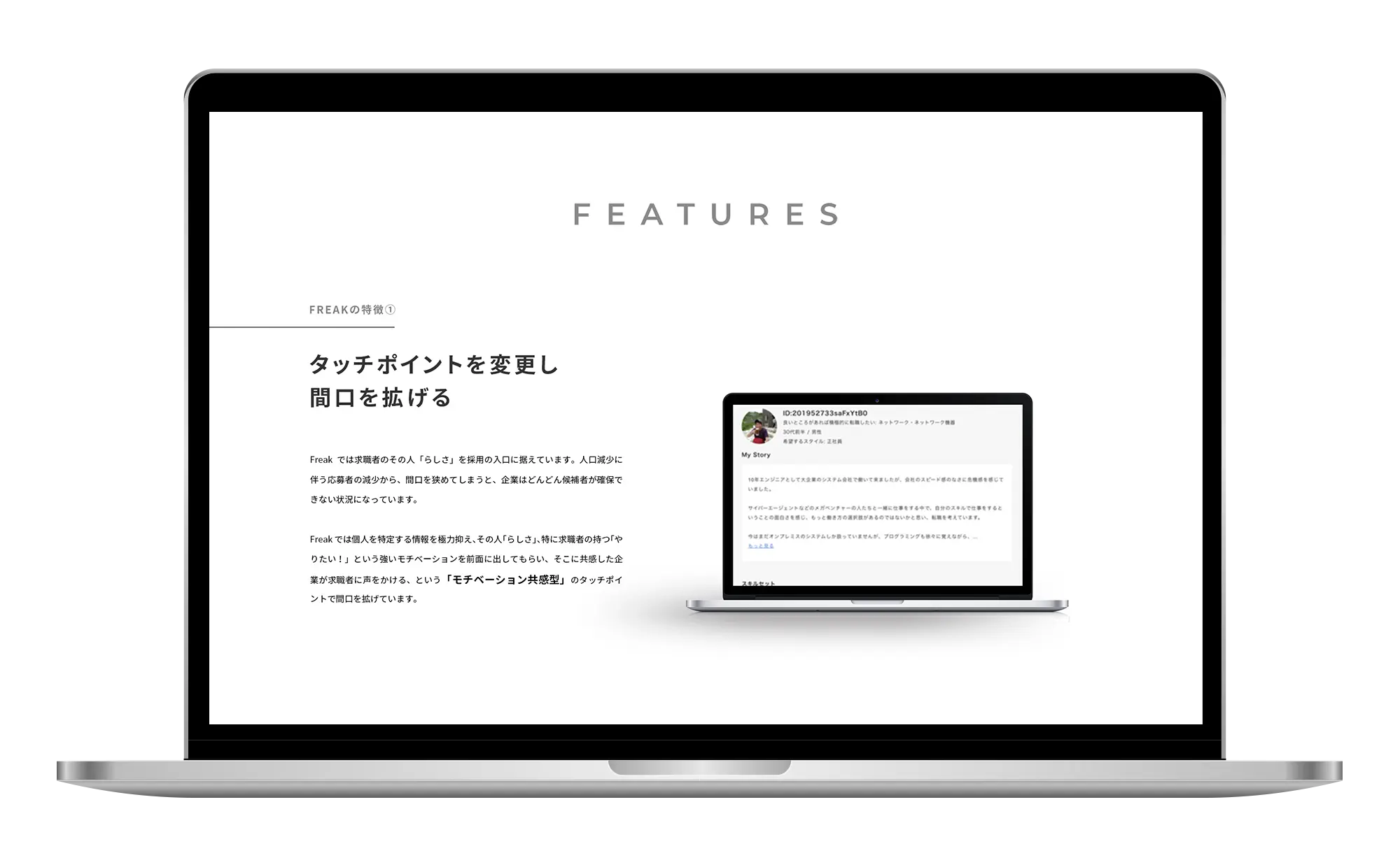 Freak Web Site Freak メンバー プロデューサー:1名 アートディレクター:1名 デザイナー/コーダー:1名 担当範囲 デザイン、コーディング 期間 2019年10月〜12月 制作会社に入社して間も無くの頃、転職エージェント様の企業向けページを制作しました。 Appleのようなかっこいいサイトにしてほしいとのざっくりしたご要望でしたが、 スタイリッシュさを意識しつつ、企業の人事担当者がスムーズに情報をキャッチできるよう工夫しました。 BACK